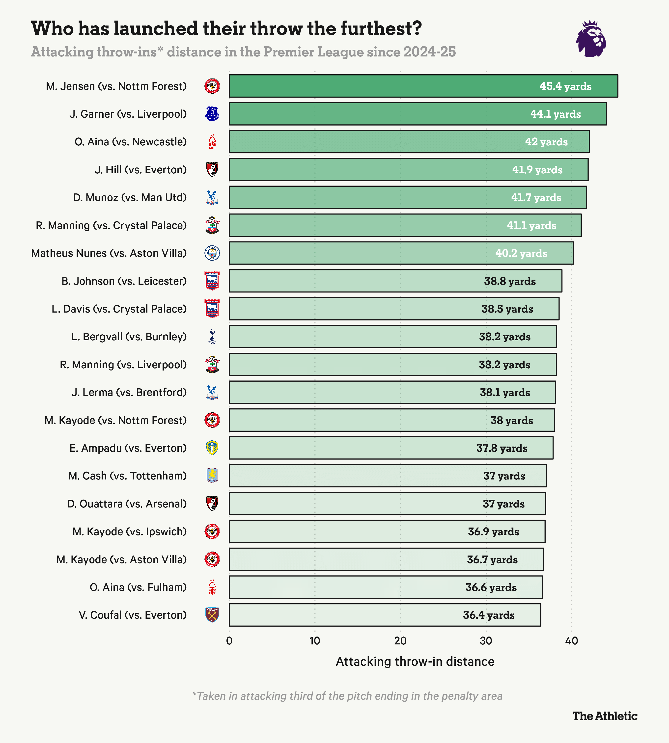值得一提的是,布伦特福德还拥有英超中掷出最长界外球的球员,马蒂亚斯-延森在上个月对阵诺丁汉森林的比赛中掷出了45.4码的距离,这是自上赛季以来最长的进攻性界外球。